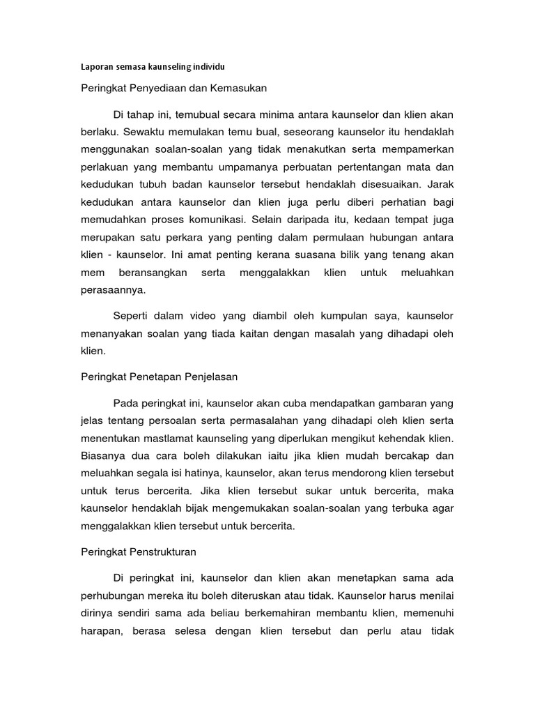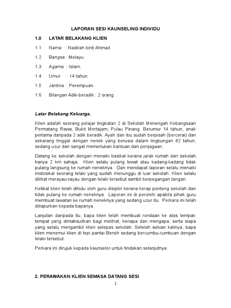 Pendekatan ini digunakan dengan alasan bahwa konseli hendaknya bertanggungjawab atas apa yang telah menjadi pilihannya, yaitu pindah ke bimbingan dan konseling, dan menghadapi segala konsekuensinya. Laporan sesi kaunseling individu 1. So please help us by uploading 1 new document or like us to download Laporan sesi kaunseling individu tarikh. Dalam cara ini pemberian bantuan dilakukan secara face to face relationship (hubungan muka ke muka,atau hubungan empat mata). Konseling individu terjadi ketika seorang konselor bertemu secara pribadi dengan seorang siswa untuk tujuan konseling. Konseling individu terjadi ketika seorang konselor bertemu secara pribadi dengan seorang siswa untuk tujuan konseling. Laporan pelaksanaan konseling individu sekolah semester tahun guru bk : Contoh konseling individu materi pelatihan bimtek guru bk implementasi kurikulum 2013 hak cipta p4tk penjas dan bk. Lisnawati dewi 1211401057 semoga allah swt, meridhoi usaha penulis dan semoga laporan ini bermanfaat khususnya bagi penulis umumnya bagi kita semua. Sskc 2323 kemahiran kaunseling individu (group a) 2. Merupakan bantuan yang diberikan kepada individu untuk menguasai kemampuan atau kompetensi (konten) tertentu melalui kegiatan belajar. Kesimpulan layanan konseling individu merupakan upaya yang unik.