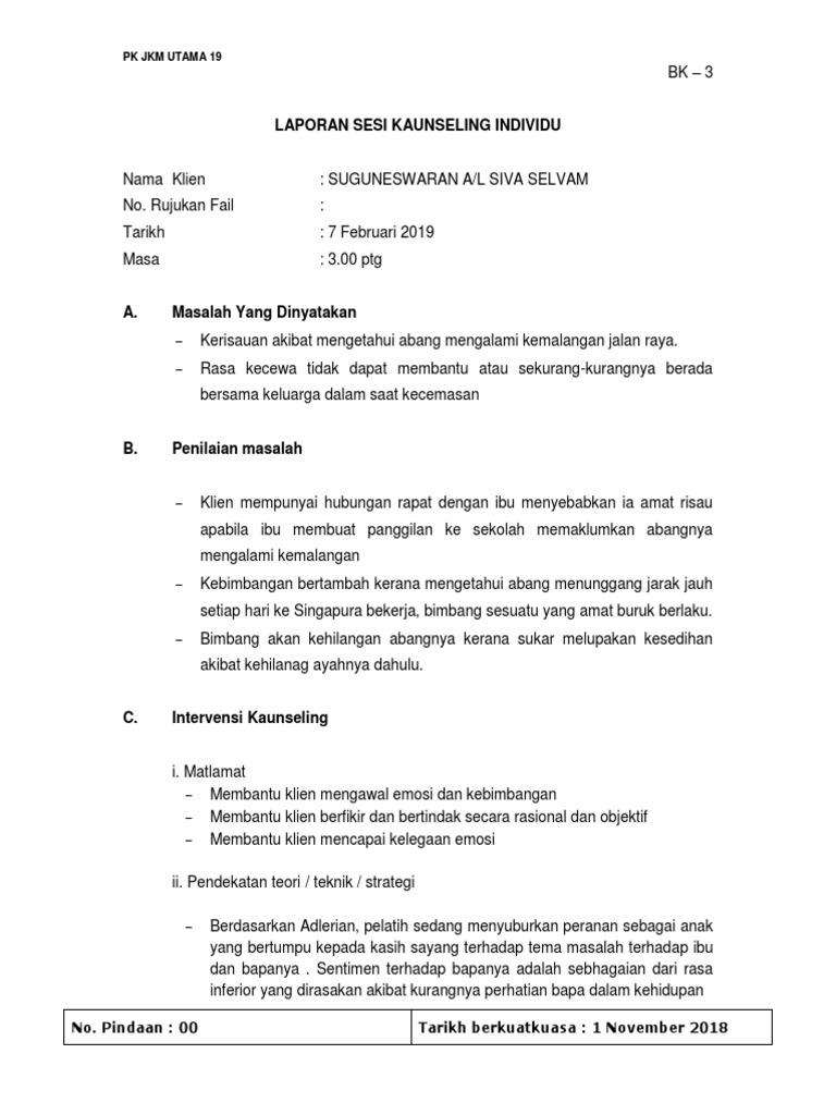 Tekanan dalam pelajaran dan perhubungan dengan keluarga. Laporan sesi pertemuan pertama harus mengemukakan aspek a, b dan c. Documents similar to format laporan sesi kaunseling individu. Disusun guna memenuhi tugas ulangan tengah semester mata kuliah: Merupakan bantuan yang diberikan kepada individu untuk menguasai kemampuan atau kompetensi (konten) tertentu melalui kegiatan belajar.