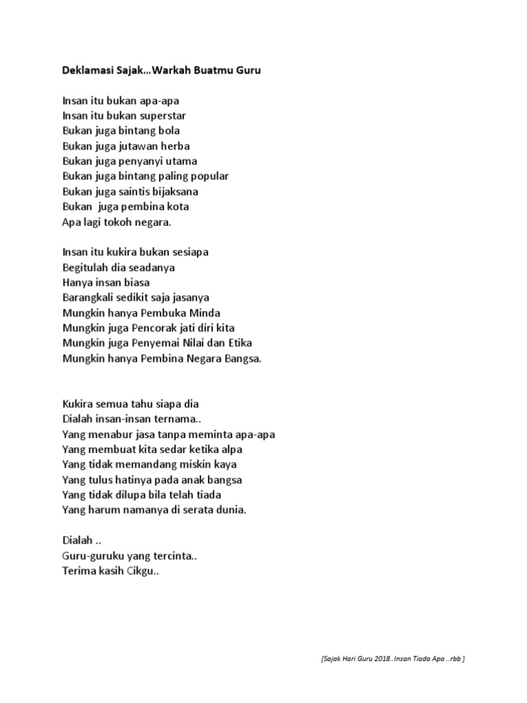 Pantun tentang jasa guru, boleh didedikasikan pantun untuk guru bersara, pantun hari guru lawak. Jasamu akan dikenang sehingga ke akhir hayat. Sempena hari guru ini, hayatilah nukilan sajak berikut Tidak tergambar oleh bicara mahupun tutur kata, kerana banyaknya jasa kalian. Dan tak sah jugak lah kalau sambutan hari guru tak dimeriahkan dengan aktiviti persembahan oleh pelajar atau pun guru. Sajak ini ditujukan khas kepada insan yang bergelar guru. Maka saya kongsikan beberapa idea persembahan menarik yang boleh diadakan sempena hari guru. Semoga, anak didikan ini tahu betapa. Mohon izin dr admin untuk saya ambil kata2 d sini yer tuk jadikan ucapan sempena hari guru yer.syukran. Posted by zila at 8:13 am. Sajak istimewa sempena hari guru yang dideklamasikan oleh guru besar sk methodist yang juga pemenang tempat pertama pertandingan deklamasi sajak kategori guru. Sajak ini mengemukakan tema tentang penghargaan kepada para guru melalui sambutan hari guru. Pertandingan menulis sajak dan artikel sempena hari guru 2014.