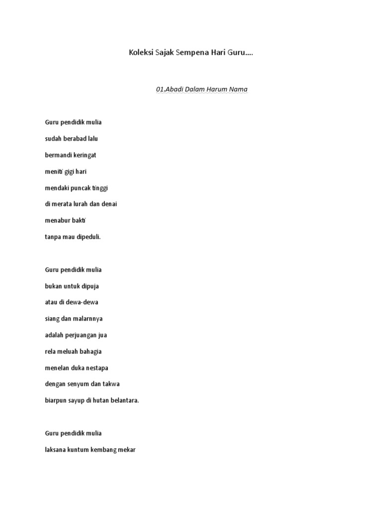 Ucapan wakil murid sempena hari guru tuesday, 17 may 2011 • 02:08 •. Website pendidikan, terlebih dahulu mengucapkan selamat hari guru nasional indonesia. Mohon izin dr admin untuk saya ambil kata2 d sini yer tuk jadikan ucapan sempena hari guru yer.syukran. Sajak sempena sambutan hari guru 2016. Cantik bahasa sigadis desa, jinak merpati perilakunya; Jinak merpati perilakunya, bersulam tekat selendang suri; Deklamasi sajak sempena sambutan hari guru peringkat daerah kulaijaya 2013. Guru adalahibupengasuhbudiman guruadalahratulebah lalumemujukmembelaikelopak cintakasihsayang lilinnyaberbungasinarcahaya madunyaberbungapenawarjiwa. Jasamu akan dikenang sehingga ke akhir hayat. Sajak yang biasa kita dengar sempena hari guru adalah guru oh guru. Hormati taati muliakan dirinya, barulah berkat ilmu dipelajari. Maka saya kongsikan beberapa idea persembahan menarik yang boleh diadakan sempena hari guru. Ada 20 gudang lagu pemenang pertandingan sajak sempena hari guru terbaru, klik salah satu untuk download lagu mudah dan cepat.